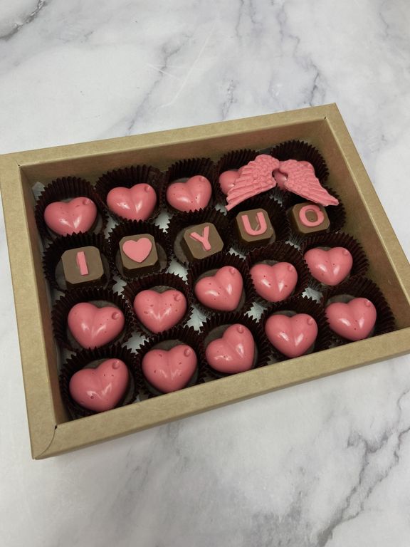 Молочный и клубничный шоколад, в каждой конфете орех.