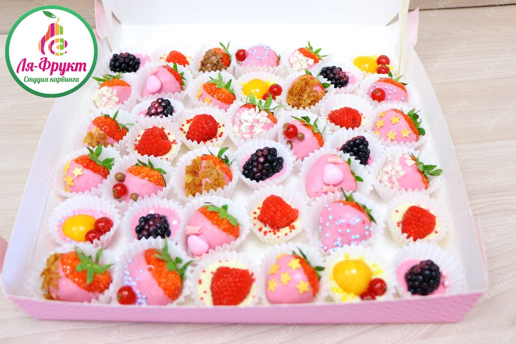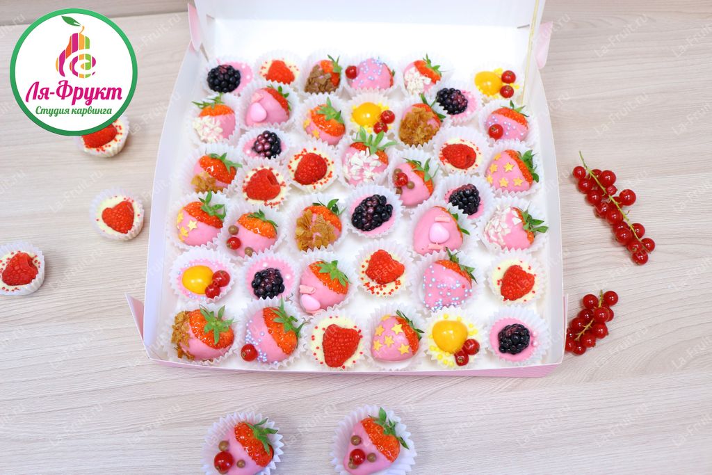 Состав: клубничка в клубничном шоколаде со всевозможными посыпками, ежевика, красная смородина, малина, физалис белый шоколад.