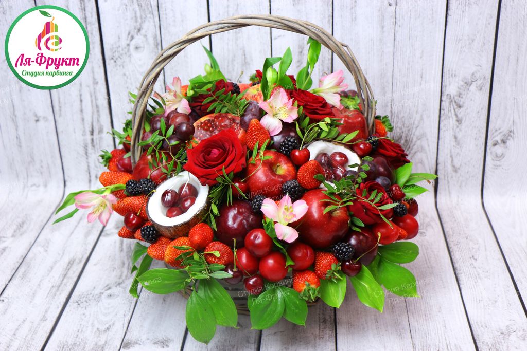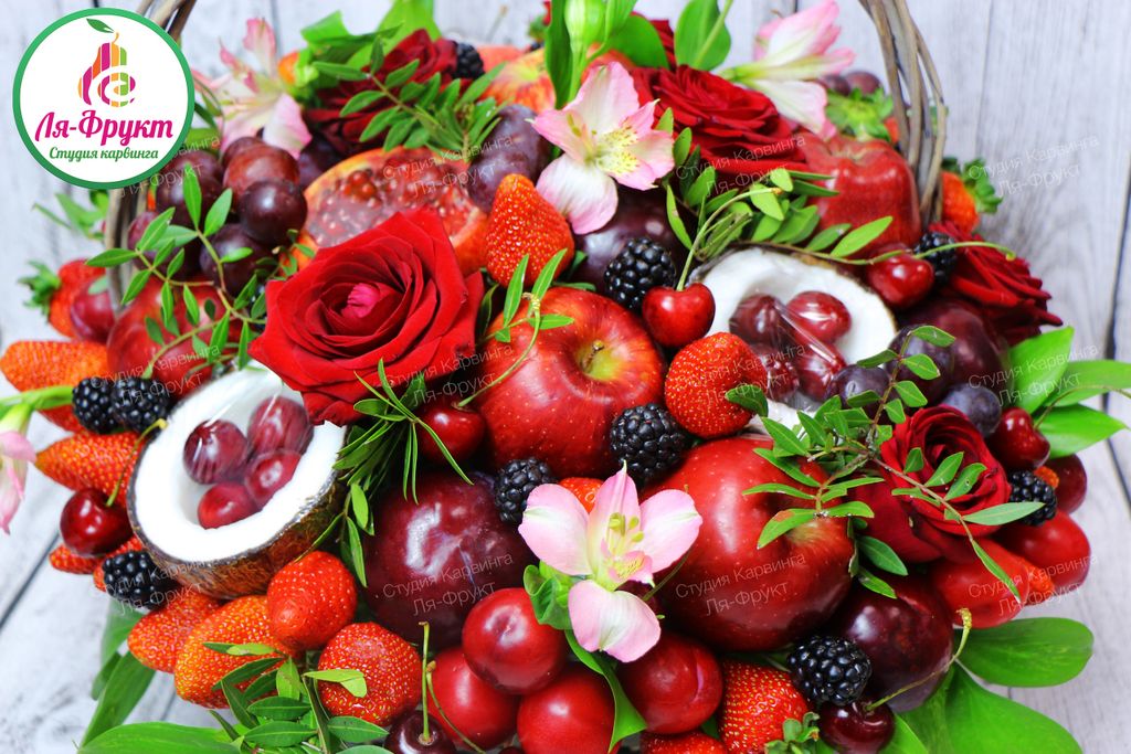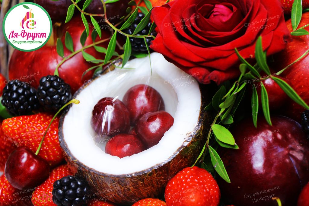 Состав: кокос, яблоки, клубника, ежевика, виноград, грана (черешня, слива в сезон) розы, альстромерия, зелень для украшения.