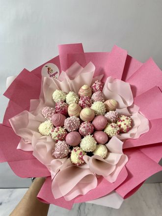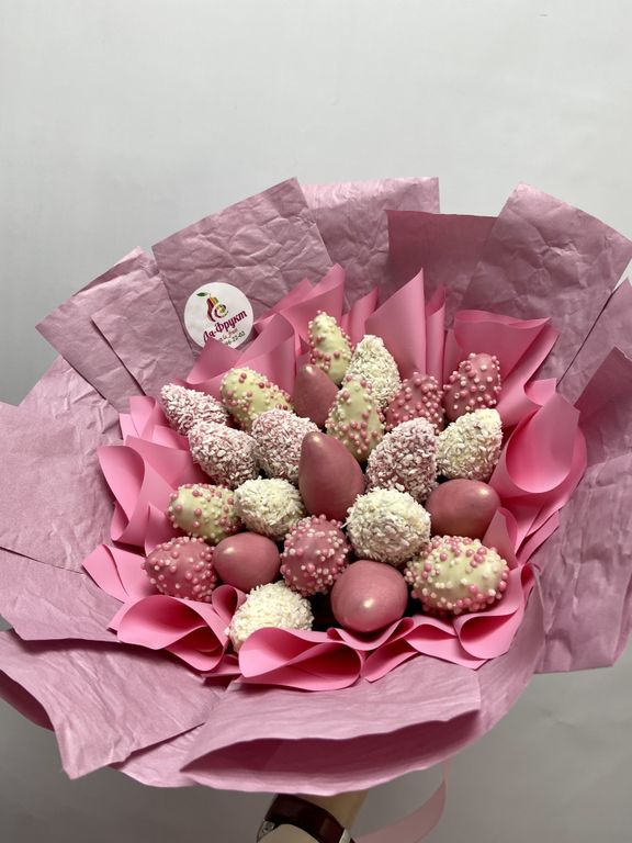 Состав: 350 г (500 г, 750 г) клубники, в шоколаде (белый, розовый), всевозможные кондитерские посыпки, кокосовая стружка.