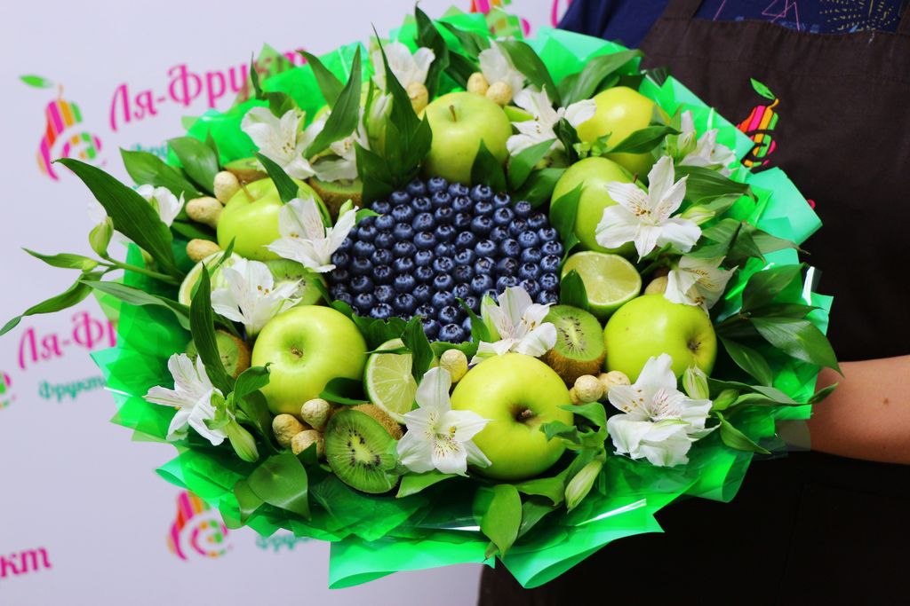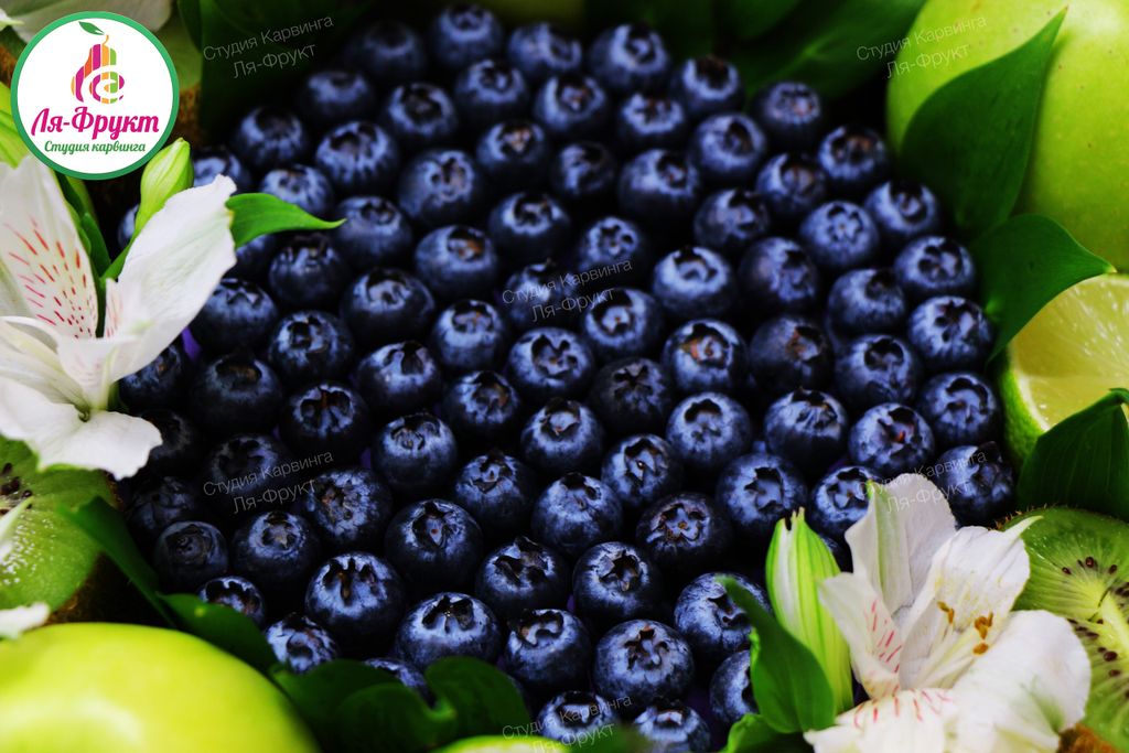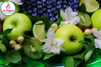 Спелая голубика, зеленые яблоки, киви, лайм, арахис, зелень для украшения.