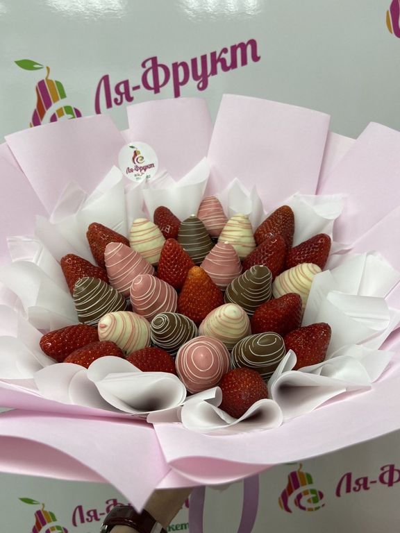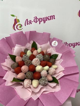 Букет из клубники в молочном, белом и розовом шоколаде с добавлением посыпки из кокосовой стружки.