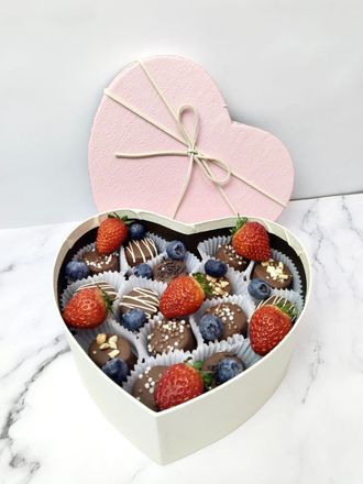 Подарочный набор с бананами в молочном шоколаде с кондитерскими посыпками, клубникой и голубикой.Вес: 450 г